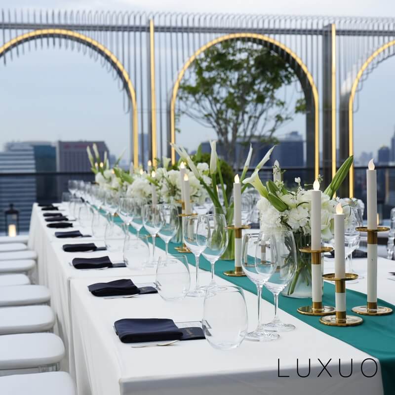 สำหรับรอบเย็นนั้น หลังจากที่ทัวร์ชมห้องเป็นที่เรียบร้อยแล้ว แขกผู้มีเกียรติอีกกลุ่มหนึ่งก็มีโอกาสขึ้นไปชมวิวกันแบบสบายๆ ช่วงตะวันกำลังจะลับขอบฟ้าบนดาดฟ้าชั้น 30 ที่ปูด้วยหินอ่อนคาร์ราร่าสีขาวและล้อมรอบด้วยซุ้มโค้งตามแบบแพทเทิร์นที่เราได้เห็นกันตั้งแต่บริเวณทางเข้าและล็อบบี้ สระว่ายน้ำของที่นี่เป็นแบบควบคุมอุณหภูมิเพื่อความสบายของผู้ใช้บริการไม่ว่าจะเป็นช่วงฤดูกาลใดของปี และอีกมุมหนึ่งก็มีอ่างจากุซซี่ไว้ช่วยผ่อนคลายหลังจากเสร็จภาระหน้าที่ต่างๆ ในแต่ละวัน แต่สำหรับค่ำคืนนี้เราขอติดไว้ก่อน เพราะว่าแขกทุกท่านจะต้องร่วมรับประทานอาหารค่ำกับเราโดยฝีมือของเชฟเอิร์ธ ศริตวรรธน์ วันวิชิตกูร จากร้าน Saawaan ดีกรีหนึ่งดาวมิชลินซึ่งอยู่ในซอยเดียวกันกับโครงการแห่งนี้เลย โดยงานทั้งรอบกลางวันและรอบค่ำนี้ยังได้รับเกียรติจากคุณปัทมา ปิยะมณีพร รองประธานบริหาร และคุณภัคริน ทัตติพงศ์ กรรมการผู้จัดการ บริษัท พฤกษา เรียลเอสเตท จำกัด (มหาชน) มาร่วมสังสรรค์กับแขกรับเชิญอย่างเป็นกันเองและอำนวยความสะดวกในการตอบข้อคำถามต่างๆ เกี่ยวกับโครงการสุดเอ็กซ์คลูสีฟใจกลางเมืองแห่งนี้